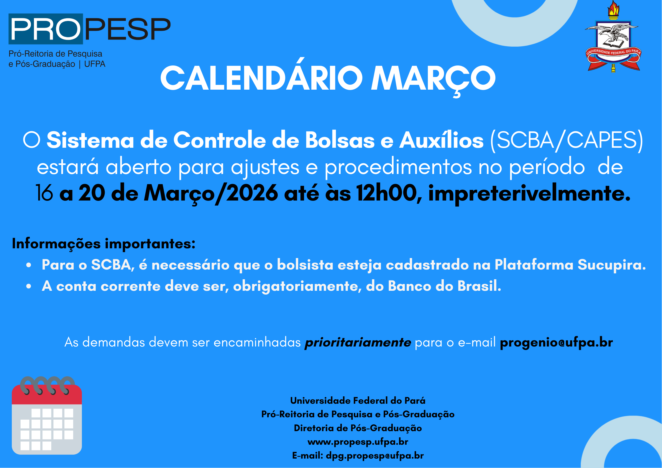 Retificamos o período da matrícula dos aprovados no processo seletivo do mestrado turma 2026, por motivo dedetização para controle de pragas e vetores, o novo período de matrícula será de 02 a 05/03/2026, no horário das 08 às 12h e das 14 às 18h, na secretaria do Programa